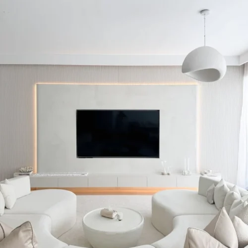 Dark Marble TV Backdrop with Matte Black Cabinets and Ambient Shelving Wall – 1,200.00. AED /Sqms